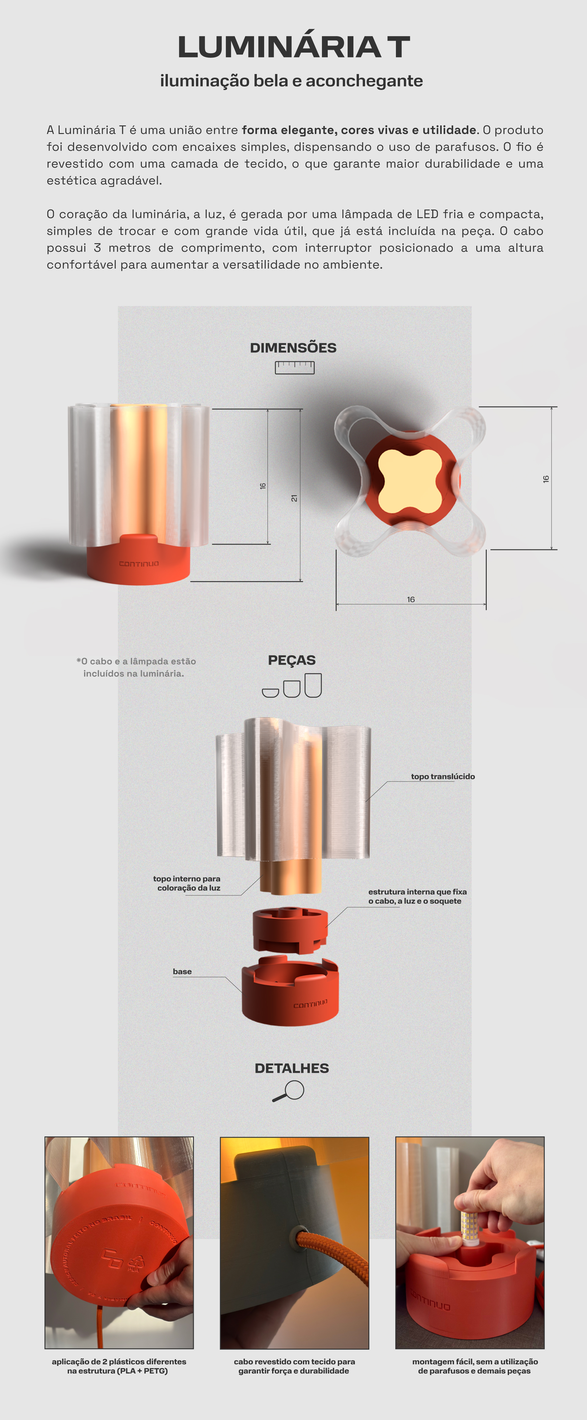 -Peças plásticas da luminária (todas as peças menos o fio, interruptores e partes elétricas) recicláveis via coleta seletiva convencional e compostáveis em ambiente industrial (normas ASTM D6400 e EN 13432). |